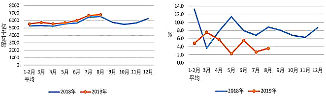 图1 2018、2019年分月全社会用电量及其增速