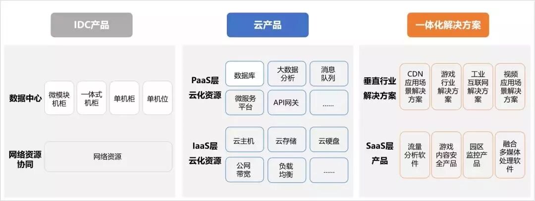 提供计算、存储、网络等IaaS层云产品,数据库、大数据平台、微服务平台等PaaS层云产品和安全、商业分析等SaaS层产品的按需租用、按量计费。